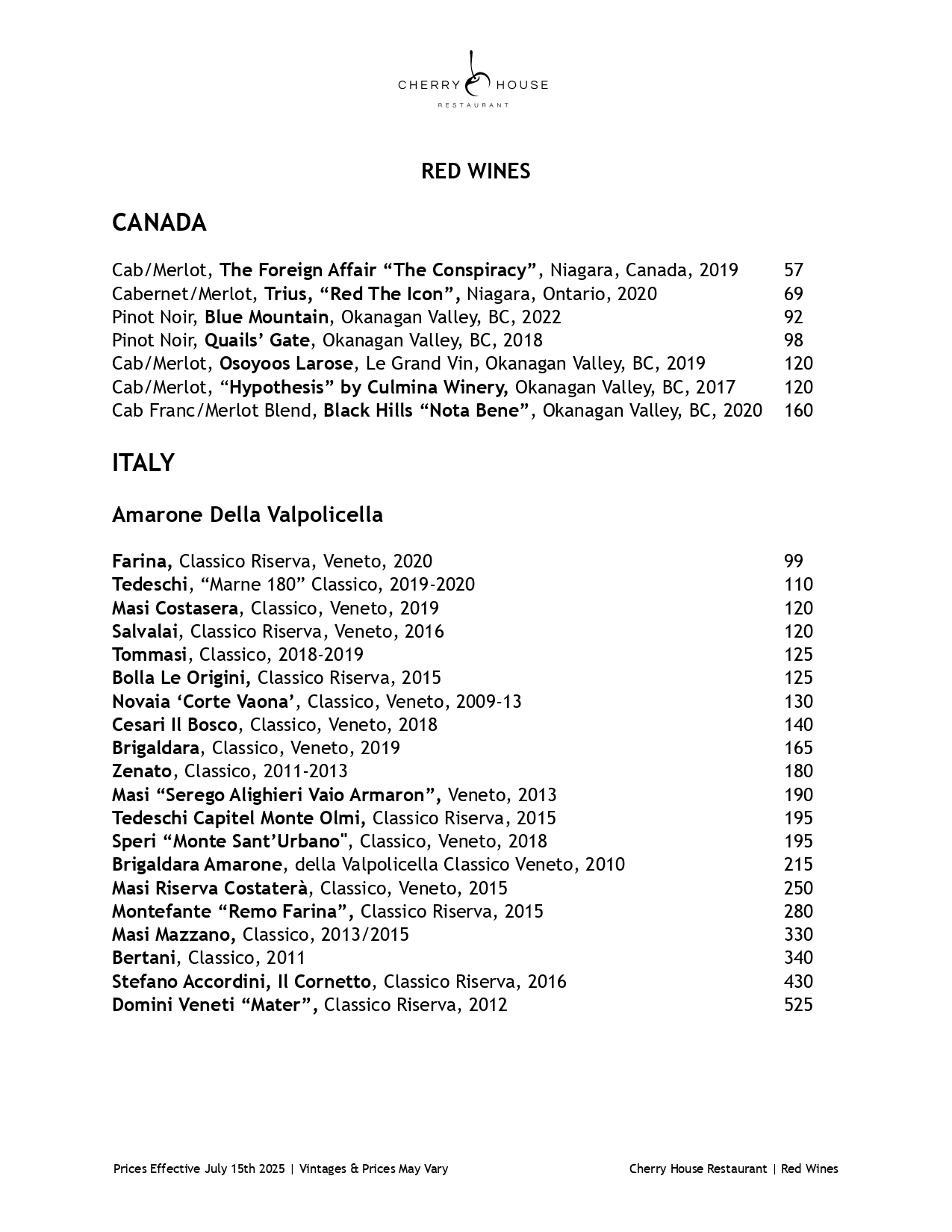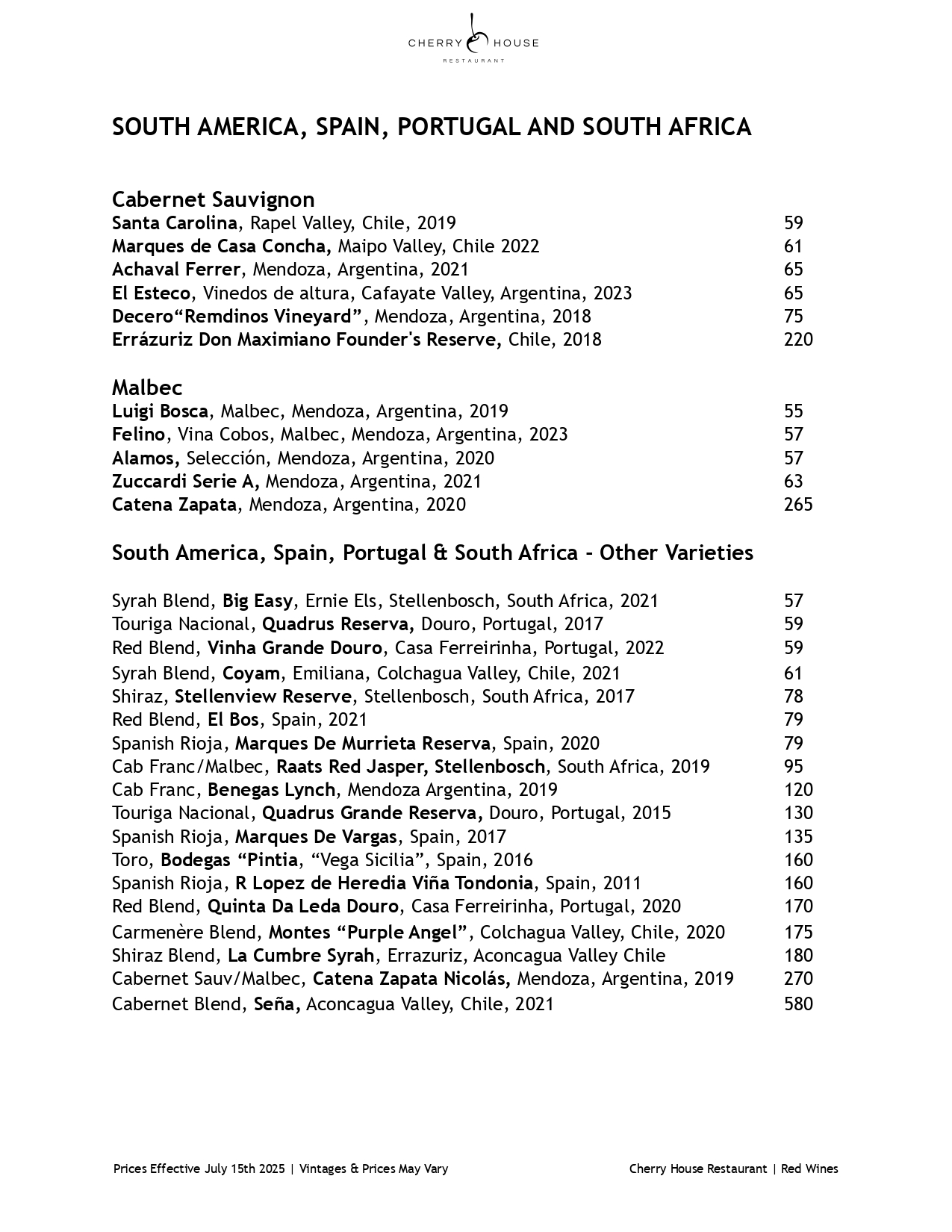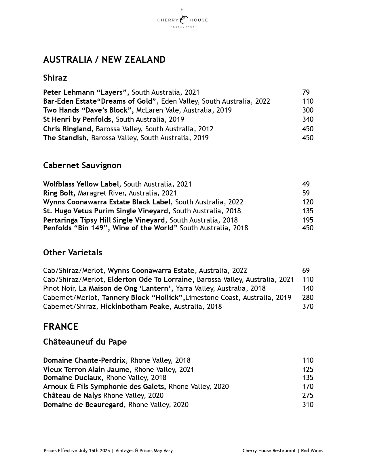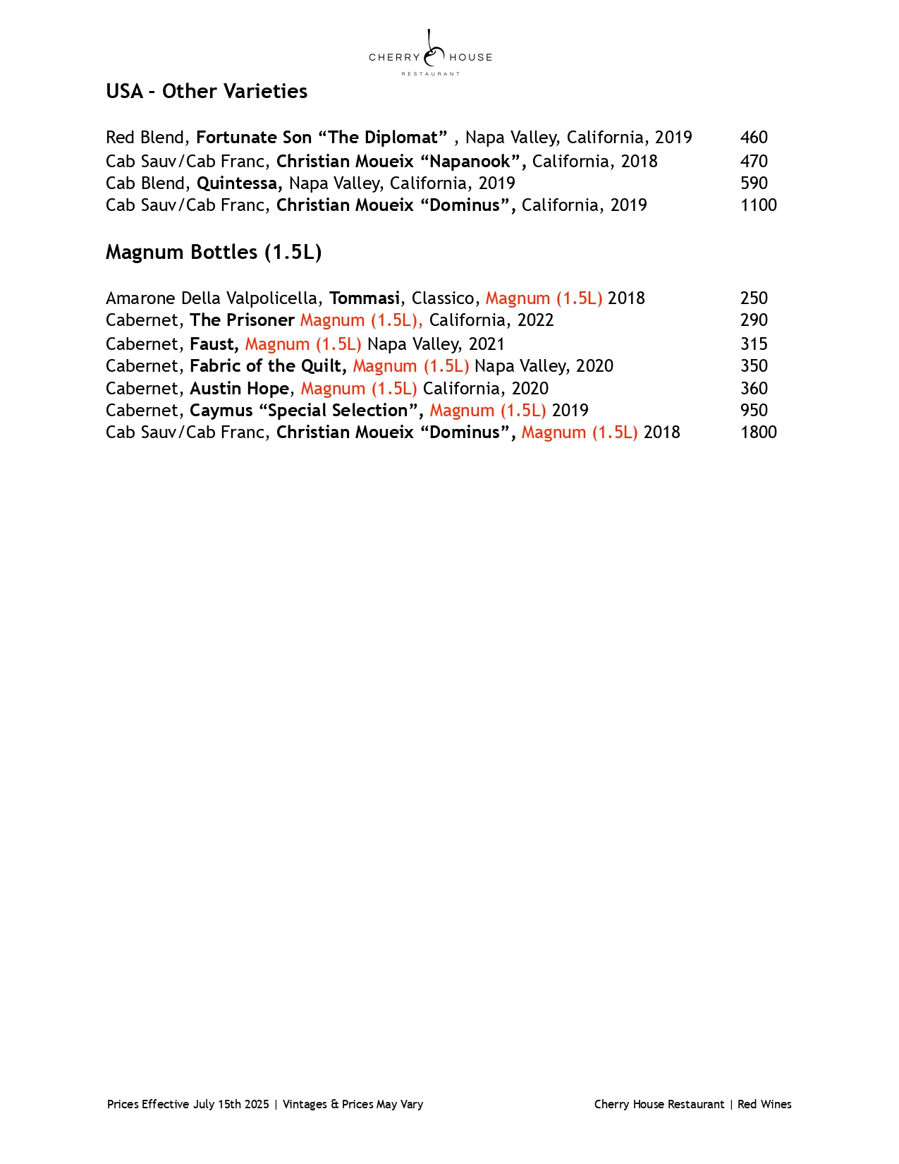Red Wine Menu
