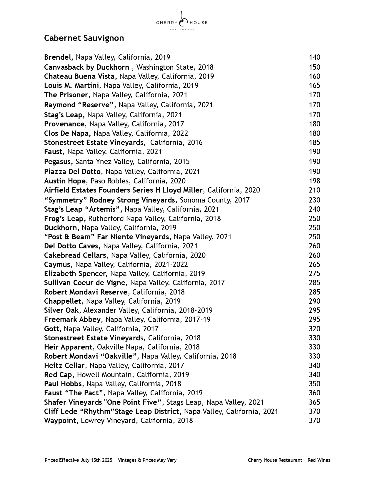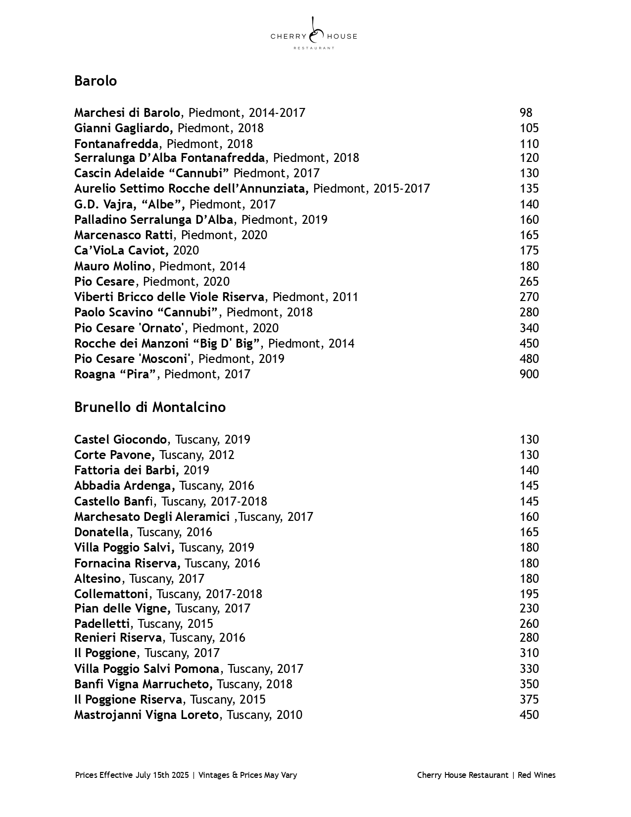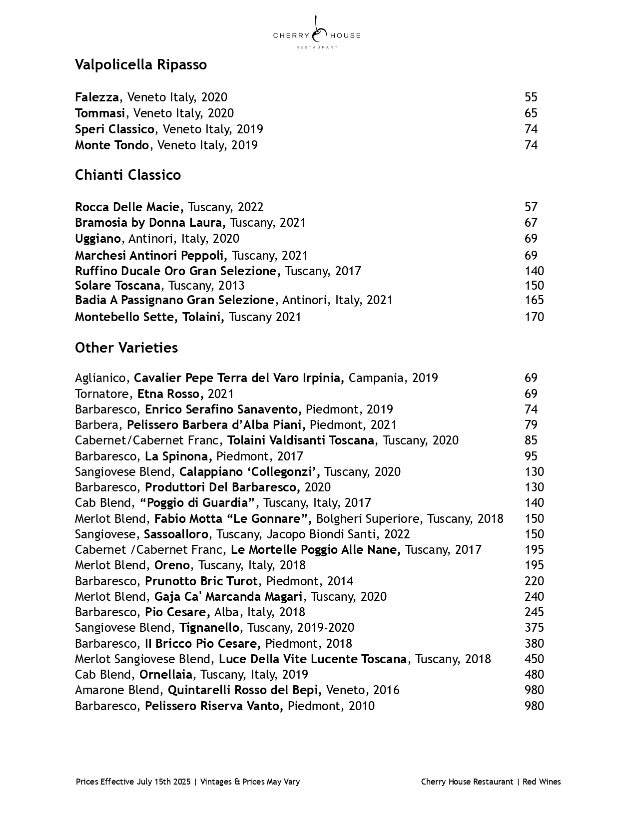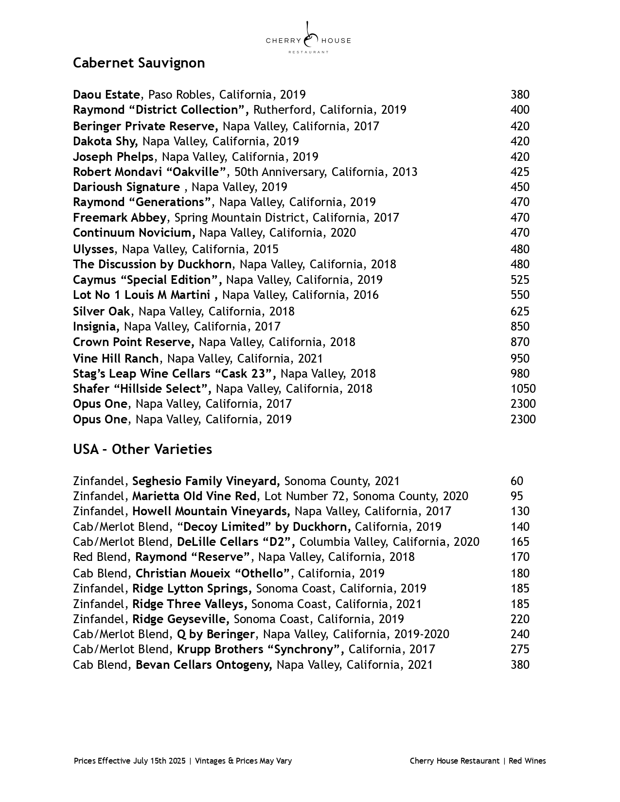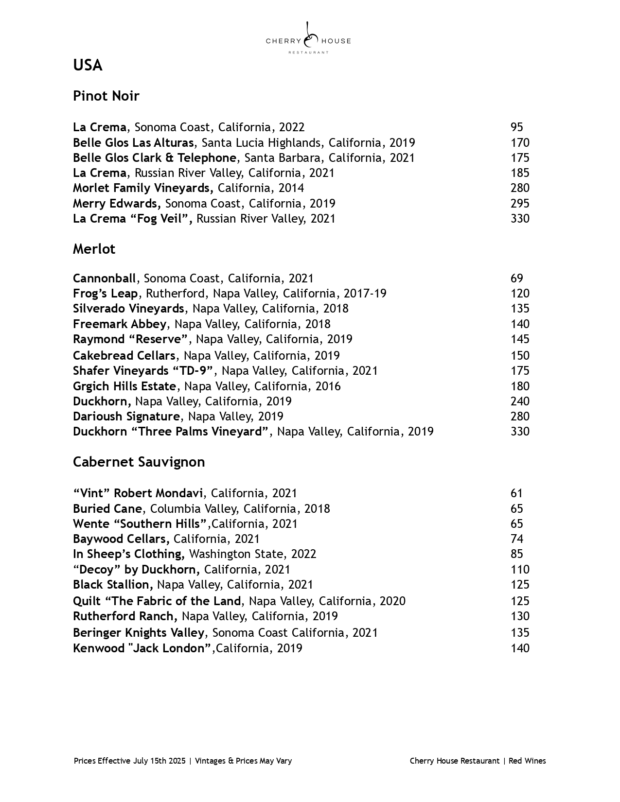 Red Wine Menu